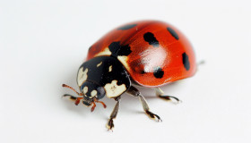 Red ladybug on a white surface showcasing vibrant colors and unique spots in close up view, insects and butterflies picture