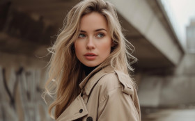 Confident woman in trench coat posing outdoors, fashion photo