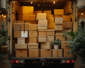 Moving truck filled with stacked boxes ready for transportation, moving day concept
