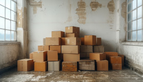 Cardboard boxes stacked against a white wall, moving day concept