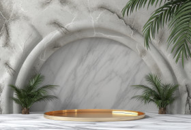 Elegant gold tray holds a delicious cake or dessert surrounded by lush green palms on the ground, brand positioning picture