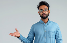 Accountant in blue shirt making a distinct hand gesture during work, brand launch concept