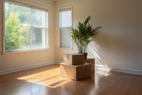 A woman sitting at a desk attentively looking at her laptop computer, urban downsizing concept