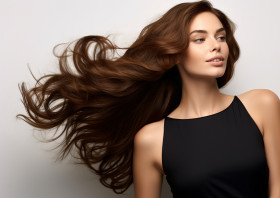 Beautiful woman with brown hair wearing black dress on white background, beautiful girl with long hair
