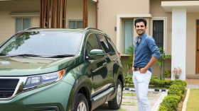 A handsome indian man standing next to his green car parked in front of a modern house