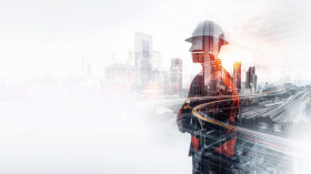 A construction worker and city buildings are shown together crea
