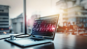 A laptop with a medical monitor and stethoscope on a table healthcare & medical concept