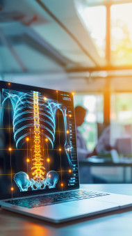 A laptop screen displaying an x ray of the spine with glowing areas indicating pain points healthcare and back pain