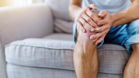 A man sits on the sofa at home holding his knee in pain showing healthcare and knee pain concept