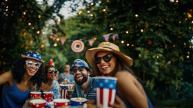 A group of friends having fun an outdoor party dressed in usa outfits and wearing sunglasses showing friendship day