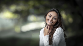 An american woman smiling with her hand under her chin in posing for a blurred background skincare concept