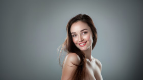 An american woman with long hair smiling at the camera for skincare campaign plain grey background skincare concept