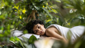 An indian woman with short curly hair lying on her back in a spa for body massage and relaxation and surrounded by greenery, nature therapy, spa treatment, relaxation