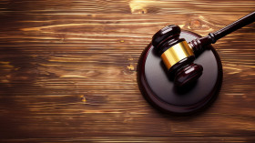 Gavel on a wooden tabletop symbolizing legal authority and court proceedings, law practice, legal profession