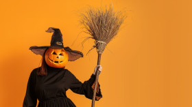 Halloween witch with a pumpkin head and broom posing on a colorful background festive and spooky, halloween, witch with pumpkin