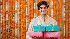 man indian young handsome cream kurti wrapped gifts diwali celebrating festive presents joyful radiant cultural elegant warm cheerful holiday charming sacred lively traditional visual graceful festive delightful modern intimate joyous vibrant happy elegantImagine Buddy