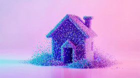 House built from tiny purple and blue particles showcasing innovative real estate investment concept
