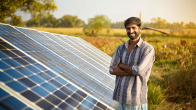 An indian farmer standing in front of solar panels in a rural field sustainability theme