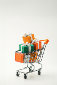 Small shopping cart with gift boxes in indian flag colors against white background