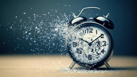 Alarm clock breaking into pixelated particles symbolizing time management