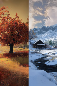 landscape autumn winter comparison weather seasonal change nature fantasy game settings seasonal change picturesque contrast transformation outdoors dual visual contrast nature landscape seasonal transition scenery changing seasons seasonImagine Buddy
