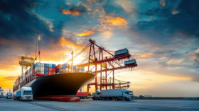 Large cargo ships and trucks loading containers at modern ports during sunset