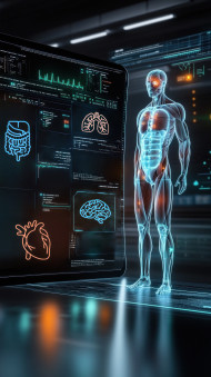Holographic display of human body showing detailed data points and interactive elements, digital health diagnostics, medical data visualization, patient monitoring