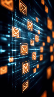 Blurred screens displaying orange and blue email icons in various sizes, illustrating multichannel marketing for digital communication