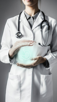 Doctor in a white coat with stethoscope holding a virtual glowing stomach icon against a gray background, focus on digestive health, stomach pain, and pediatric gastroenterology