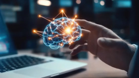 Businessman touching a glowing digital brain icon with a laptop nearby, symbolizing neural tech, ms awareness, and muscular sclerosis innovation