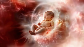 Baby in the center of a warm toned abstract background with red highlights, depicts early development and postpartum care focus