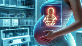 Woman holding a holographic screen baby in front of her belly, represents advanced prenatal care and maternity hospital innovations for antenatal services