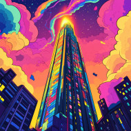 Towering skyscraper glowing at sunset with bold outlines, exaggerated expressions, and dynamic poses, rendered in cartoon style, urban skyline, and sunset scene concept