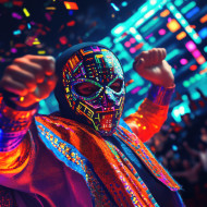 Stock market screen glowing at night, flashing numbers under a vibrant lucha libre mask and cape, bold graphic art with high-contrast colors, finance trading concept