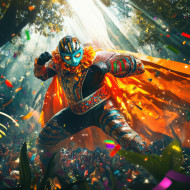 Misty forest with sunbeams shining through, wrapped in a vibrant lucha libre mask and cape, blending nature and bold graphic art with high-contrast colors, mystical nature concept