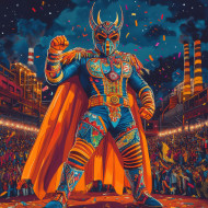 Factory with smokestacks under moonlight, draped in a vibrant lucha libre mask and cape, bold graphic art with high-contrast colors, industrial progress concept