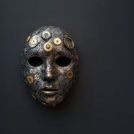 A carnival mask adorned with tiny clockwork gears, a creative fusion of traditional mask design and mechanical parts, featuring detailed found object art and 3d found object elements