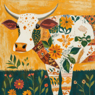 A patchwork cow decorated with floral folk patterns and vibrant colors, showcasing traditional folk art style and rustic charm, highlighting intricate folk paint details