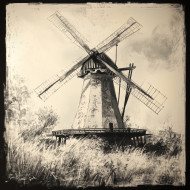 Decorated windmill with folk patterns, portrayed in the fayum style, showcasing traditional folk art and rural charm