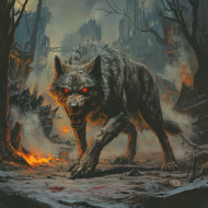 A snarling wolf with glowing red eyes stands menacingly in the dark baring its fangs, its piercing gaze glows through the shadows, grimdark fiction theme of fear and survival