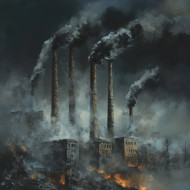 Smoke stacks belch black ash into the sky turning daylight into darkness, the air is thick with pollution, grimdark fiction of industry and ruin