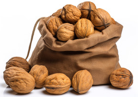 Walnuts in a bag sitting on top of a white background, walnuts image