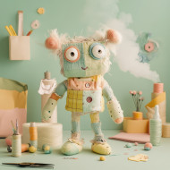 patchwork factory cotton smoke sock puppet handmade fabric buildings cute cotton clouds creative fun whimsical scene textile design toy factory setting playful character workshop artistic cozy textile art fabric buildings cute factory creative factory toy factory whimsical details toy design art stitchedImagine Buddy