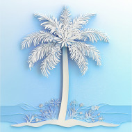 Palm tree standing tall against a crisp horizon, tropical beach vibe captured in a delicate paper cutout style. paper dolls cut out, matisse paper cutouts