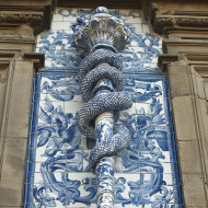 Serpent wrapped rod of asclepius in blue and white tile, azulejo style. medical and healing symbol with intricate credence azulejos and azulejo arabesco patterns