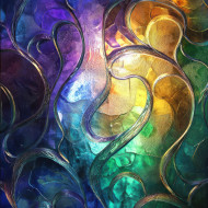 Carnival glass window glowing with radiant rainbow hues, intricate patterns reflecting light beautifully, stunning carnival glass vase, acorn carnival glass home decor