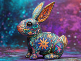 Rabbit with cosmic star markings, glowing galaxy patterns on fur, mystical alebrije animal, celestial fantasy creature, inspired by mexican folk art, alebrije, alebrije etsy