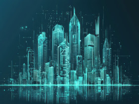 Futuristic city skyline with high tech buildings and infrastructure, detailed in a blueprint, urban planning and smart city design, blueprint test prep, aicpa blueprint