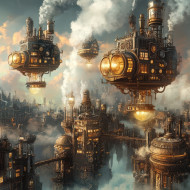 steampunk floating islands steam engines sky brass gears airships drifting victorian technology retro vintage mechanical invention sci fi cyberpunk automaton futuristic detailed glowing mystery clouds adventure engineering surreal floating atmosphere fantasy machinery city mysterious innovation dreamlikeImagine Buddy
