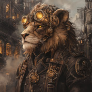 A mechanical lion with brass gears and glowing eyes roars as it prowls through a steam powered city, steampunk, steampunk clothing, steam punk outfits